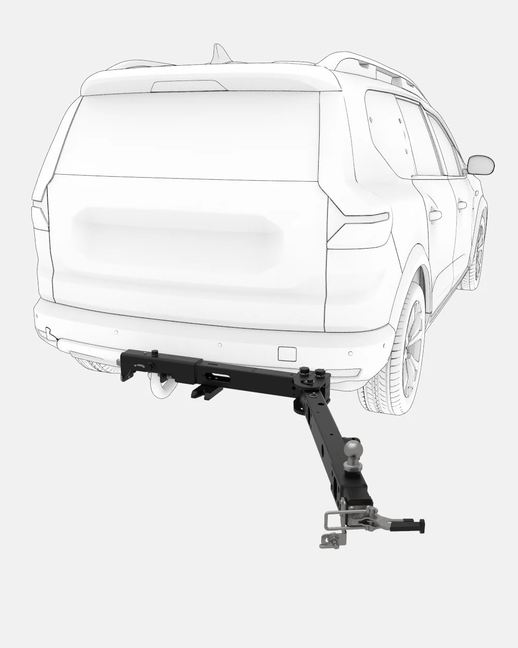 Het systeem is volledig universeel en compatibel met alle trekhaaktypes: vaste trekhaak, afneembare trekhaak en flenskogel. Hierdoor is de Skep Swing geschikt voor vrijwel elk voertuig — van SUV en terreinwagen tot bestelbus en camper.