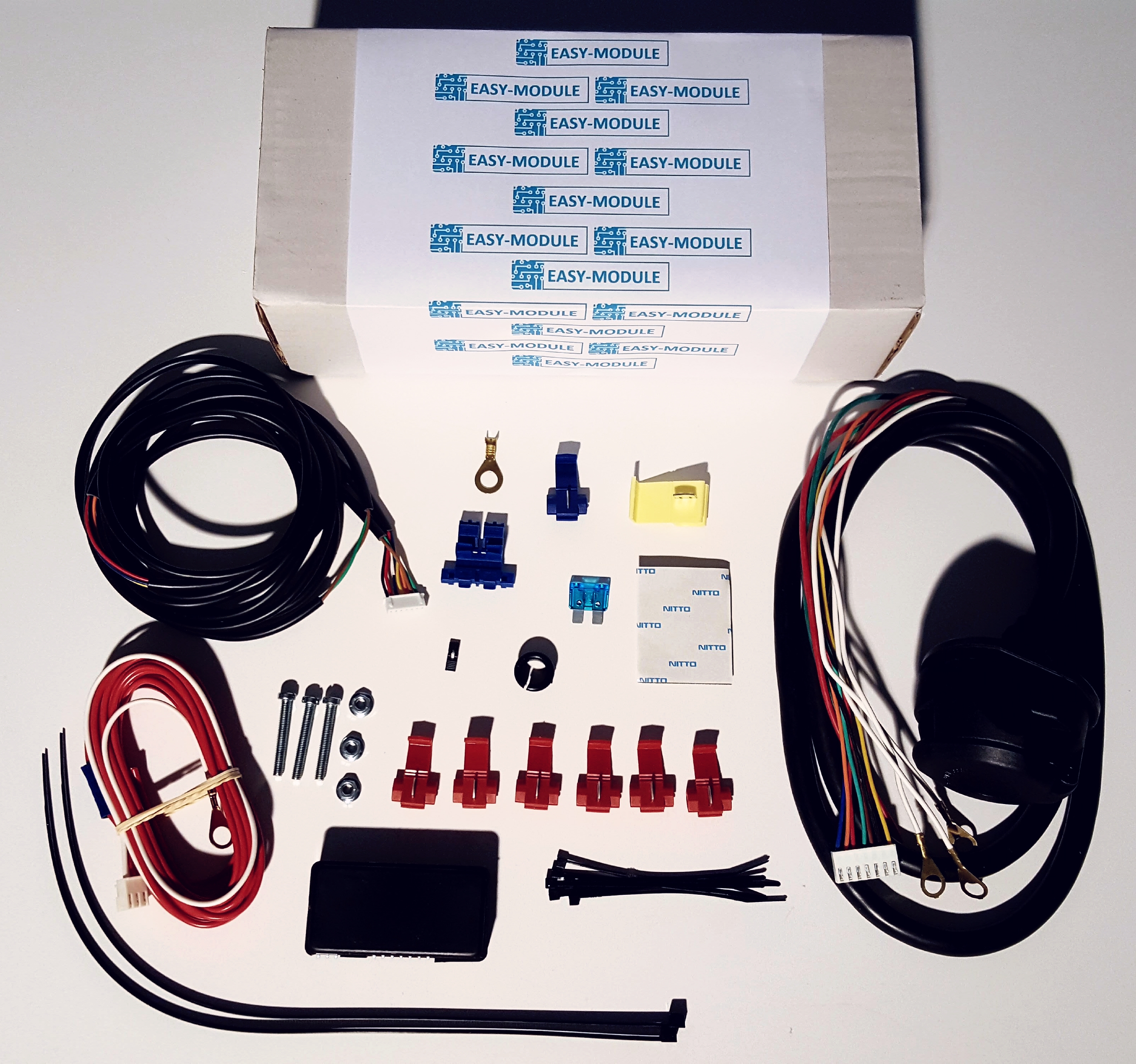 De Easy module universele kabelset is voorzien van een stekkerdoos, module, bekabeling en duidelijke handleiding.